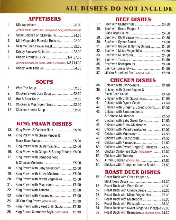 The restaurant also serves a great selection of king prawn dishes, such as King Prawn & Cashew Nuts and King Prawn with Bamboo Shoot, both offering a savory and satisfying experience.