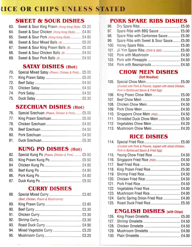If you're a fan of chow mein, you can find an array of tasty choices, including the Special Chow Mein, King Prawn Chow Mein, and Pork Chow Mein. There’s also the Singapore Chow Mein for a spicier, more exotic option.